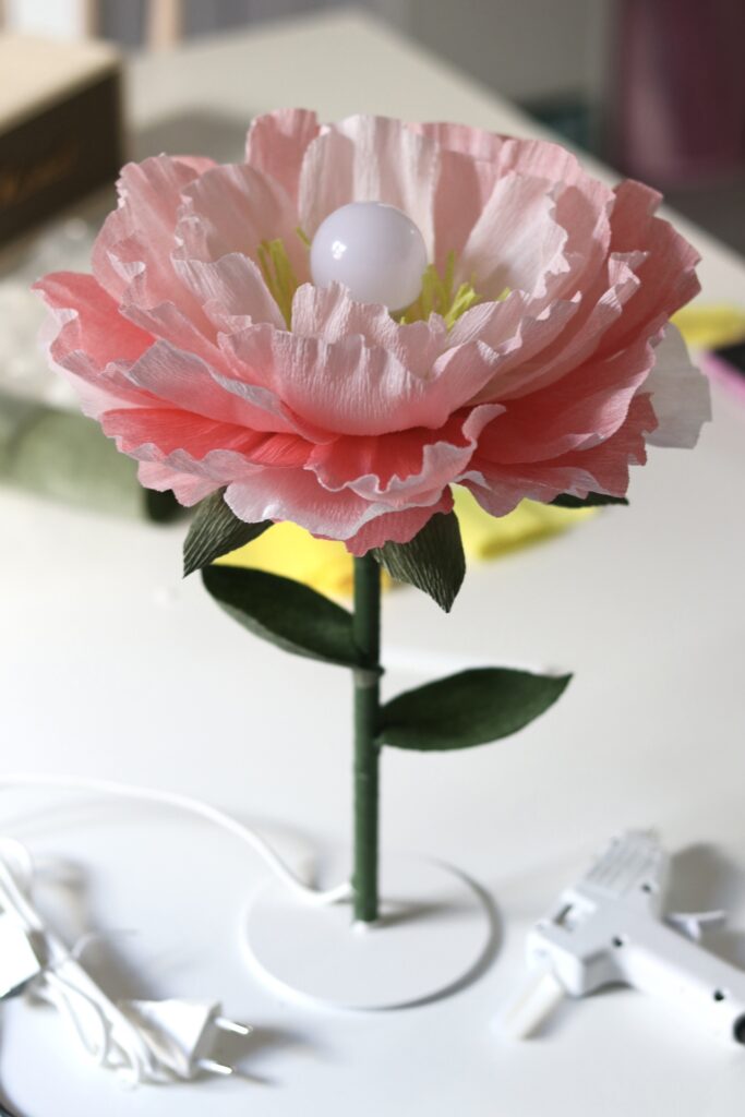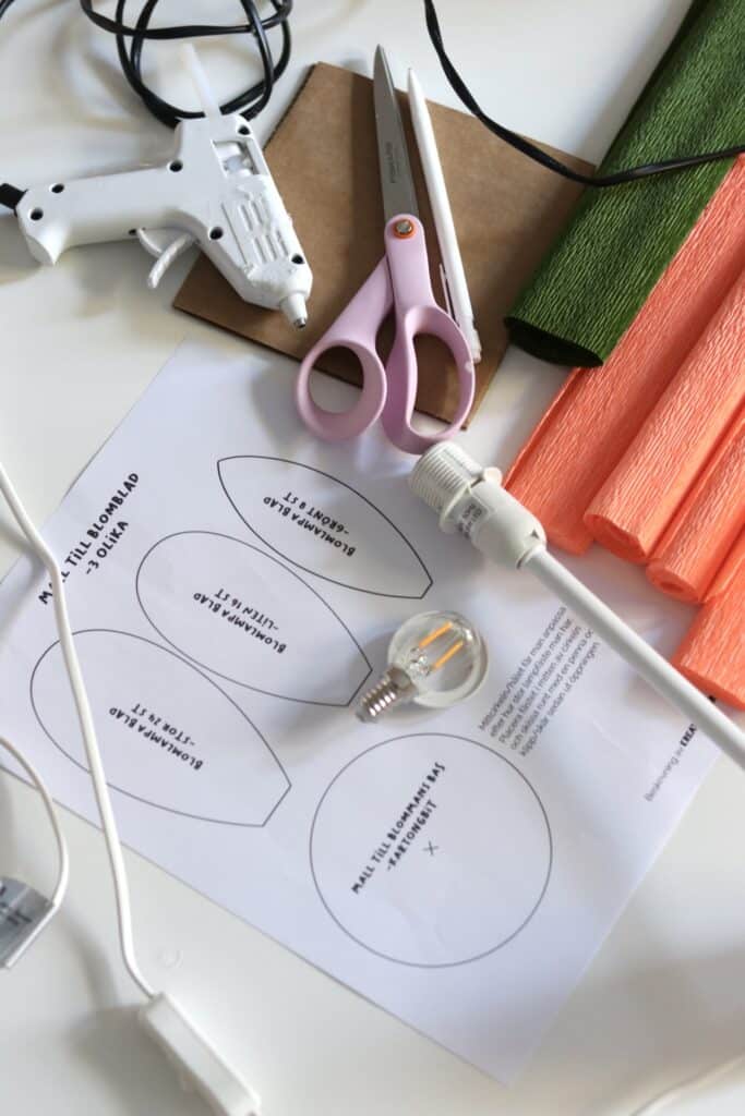 Gör en vacker stående bordslampa av crepepapper! Du behöver: en lampfot, en ljuskälla/glödlampa (LED), en rulle med crepepapper i valfri färg och en bit grönt crepepapper. En sax, en limpistol, en penna och en bit kartong. I beskrivningen gör jag fem lager med blad men vill man ha mer fluff kan man addera fler lager!