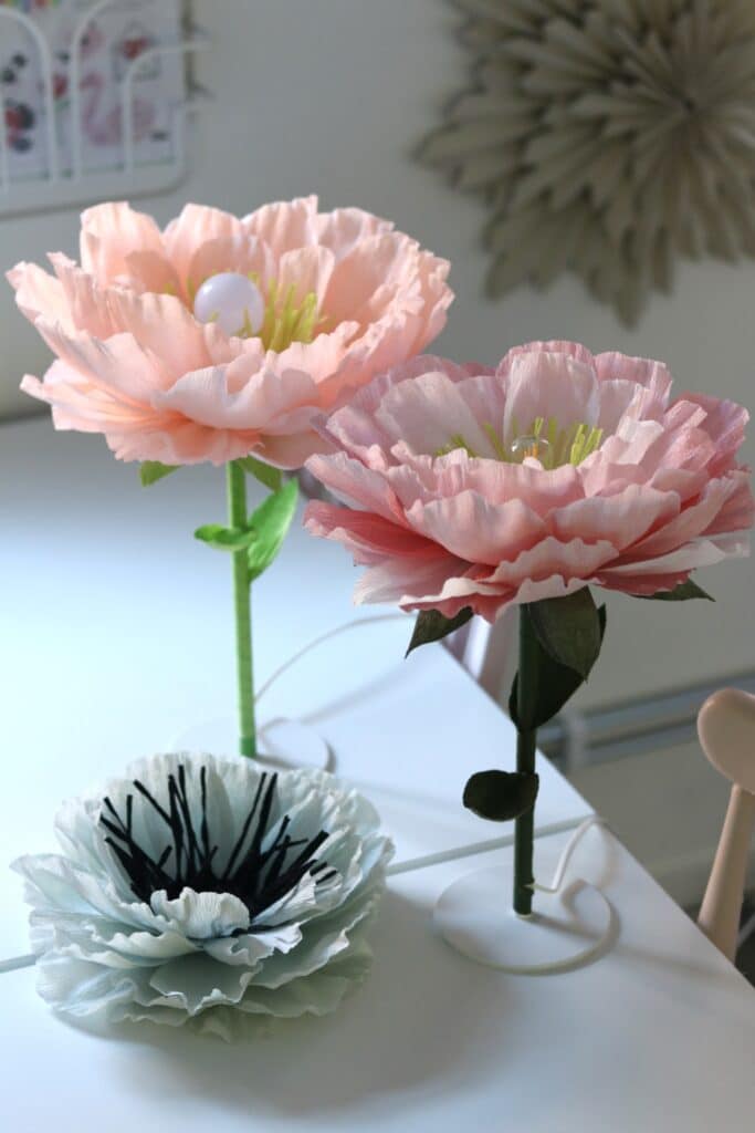 Jag har använt det exklusiva kräppappret från italienska Cartotecnica Rossi med en otrolig stretchbarhet på hela 260%. Pappret är 50×250 cm per rulle. Till blombaden har jag använt det tvåfärgade pappret i rosa/vitt och till mittdel och gröna blad har jag använt det tvåfärgade pappret i grön/gult som finns på Panduro. Limpistolen jag använder är en lågtempererad, den också från Panduro.