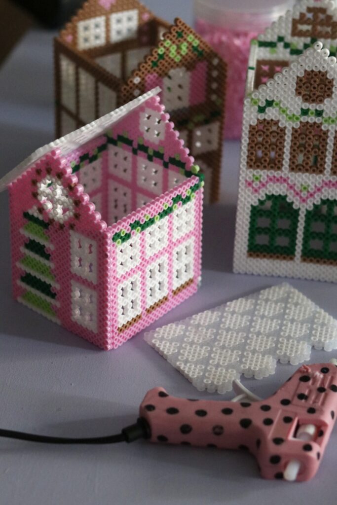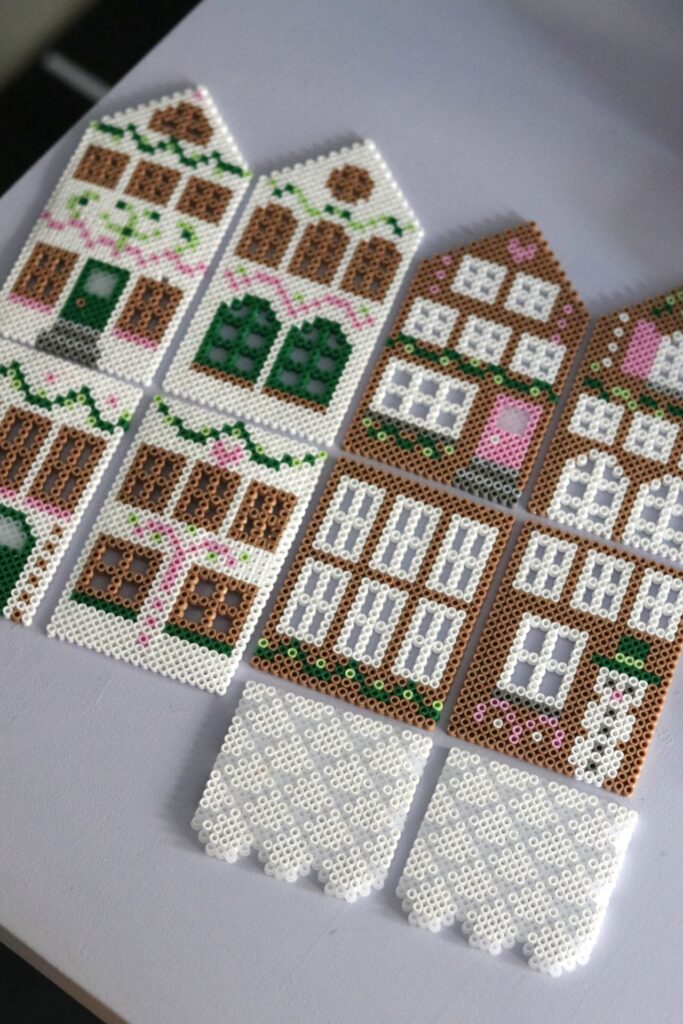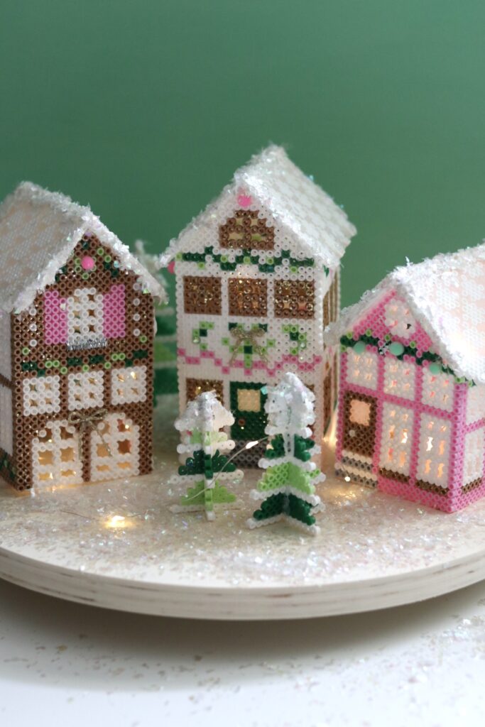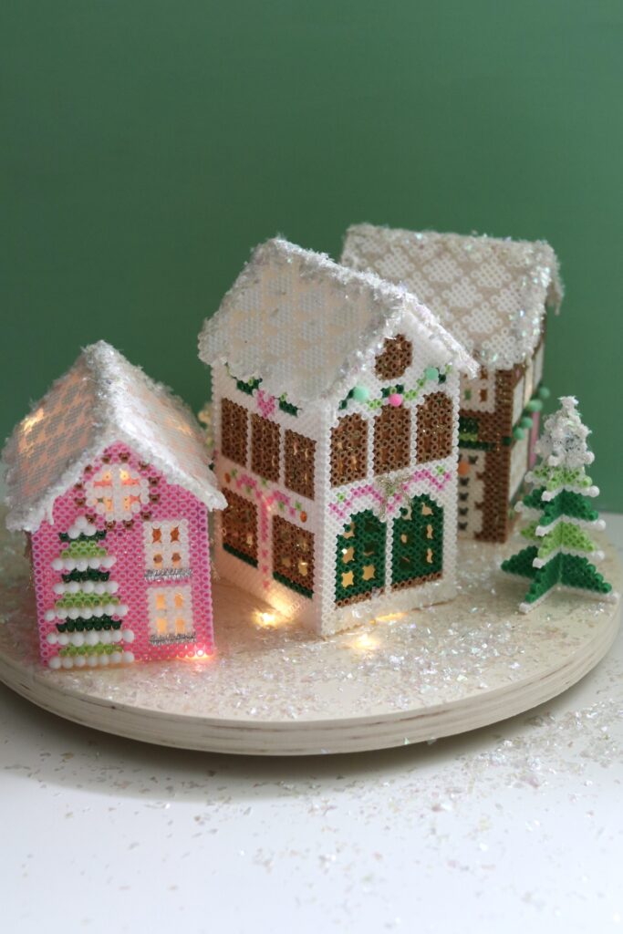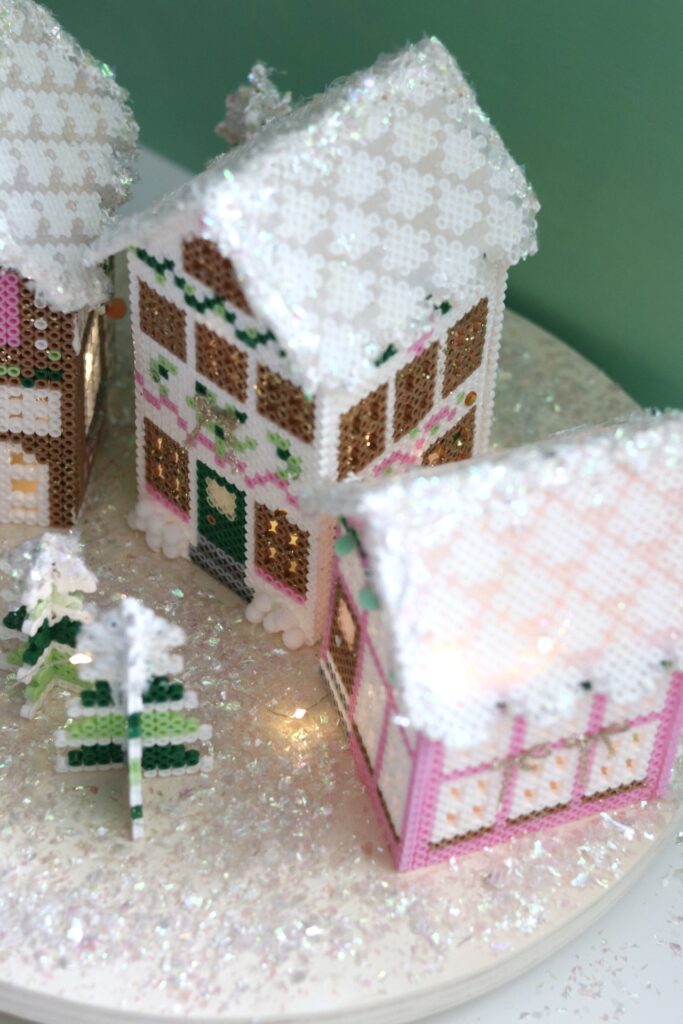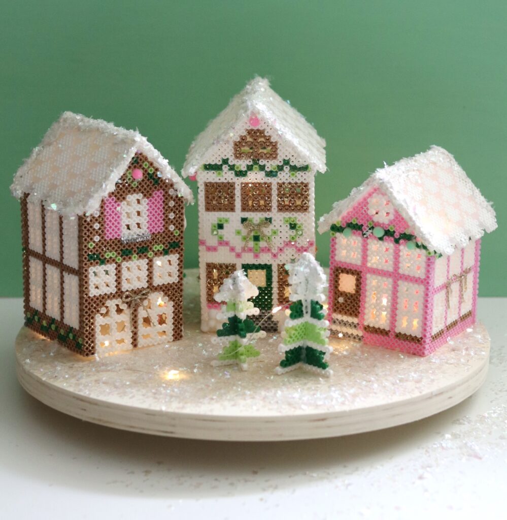 Pärla en hel liten julstad att lysa upp vintermörkret med! Mönster innehåller mallar för tre höga stadshus i vitt, brunt och rosa. Limma ihop alla husdelar med en limpistol och dekorera sedan med konstsnö, glitter, fina band, piprensare, som som-bollar och bjällror om du vill. Fyll husen med ljusslingor eller batteridrivna ljus.