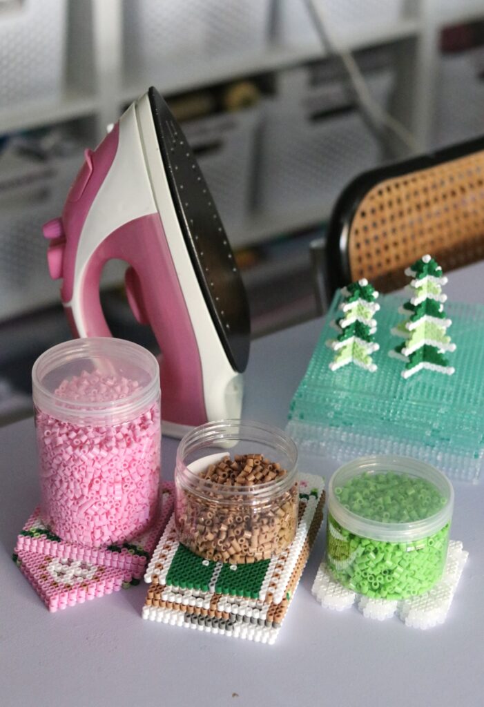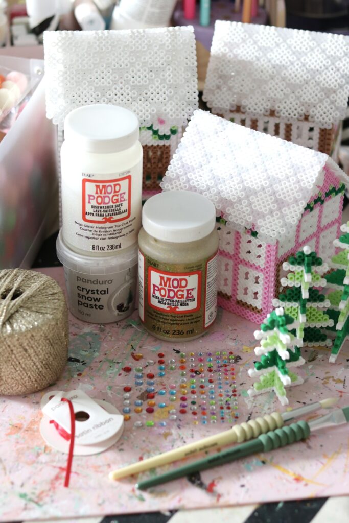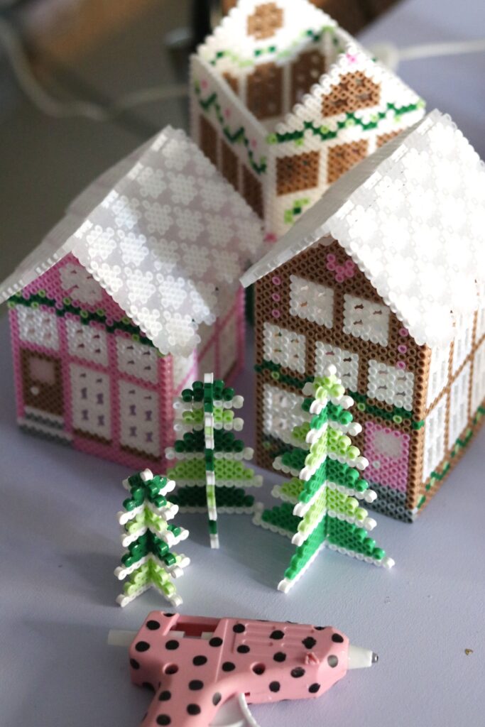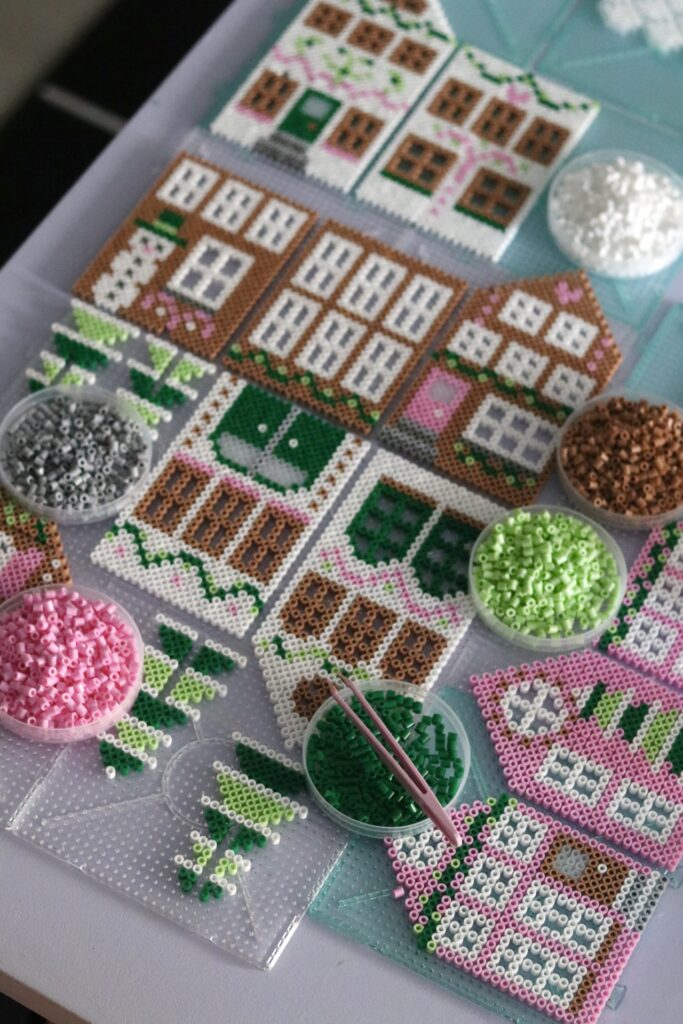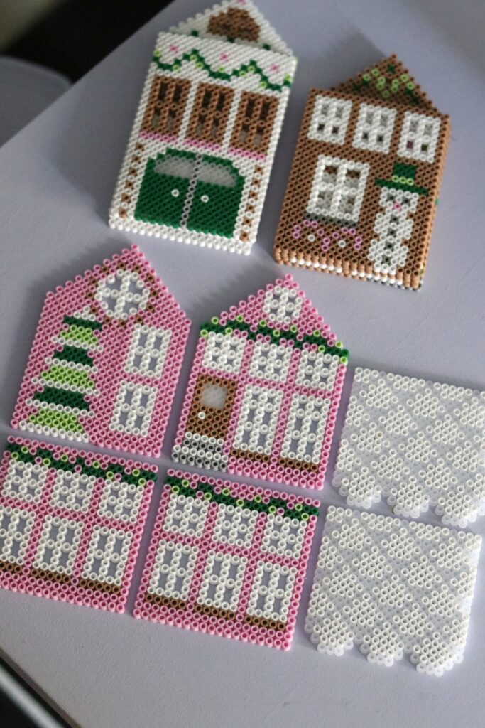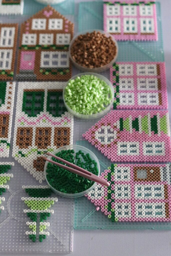 Pärla en hel liten julstad att lysa upp vintermörkret med! Mönster innehåller mallar för tre höga stadshus i vitt, brunt och rosa. Limma ihop alla husdelar med en limpistol och dekorera sedan med konstsnö, glitter, fina band, piprensare, som som-bollar och bjällror om du vill. Fyll husen med ljusslingor eller batteridrivna ljus.