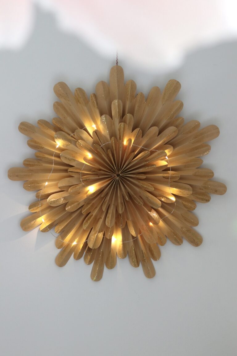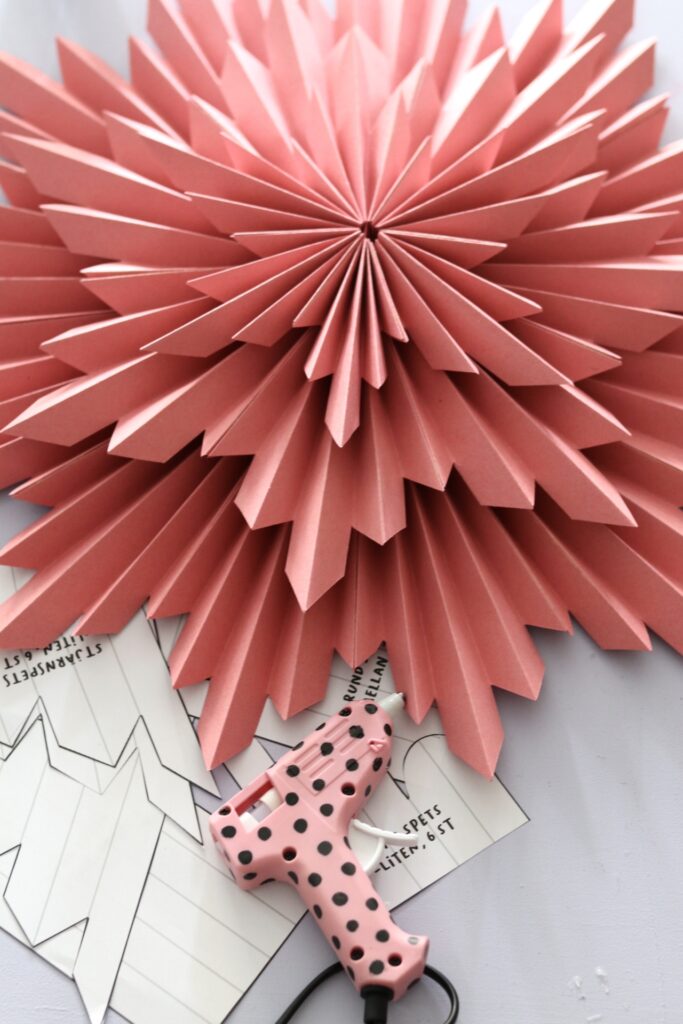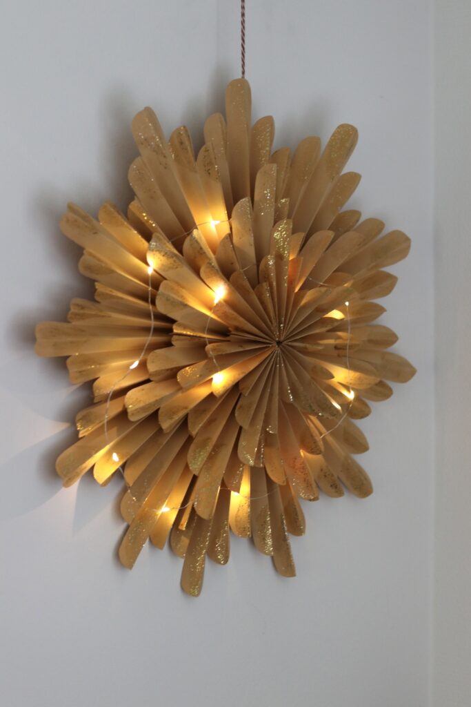 Du behöver: 18 ark vanligt A4-papper, sax, limstift eller dubbelhäftande tejp, limpistol och ett snöre för upphängning. Trä i en liten nätt batteridriven ljusslinga på tråd mellan lagren på stjärnan om du vill.