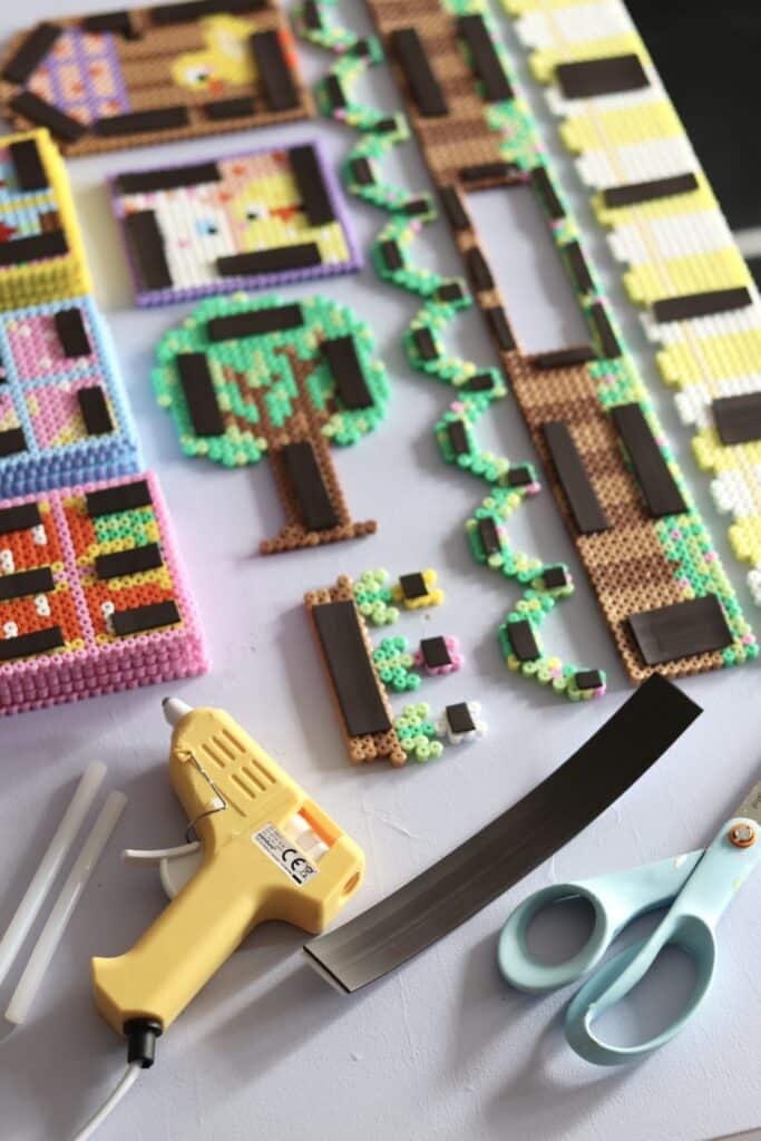 För att sätta upp fönstren på ett elskåp, en brevlåda eller kylskåpet kan man använda magnet. Det är supersmidigt och lätt att sätta upp, plocka ner och använda år efter år! Jag använder tjock magnetisk remsa från JULA som jag förstärkte med limpistolen för att garantera att det satt bra. Tejpen är lätt att klicka i olika längder med saxen. En rulle magnetisk tejp på 3 meter räckte till alla fönster och dekorationer.