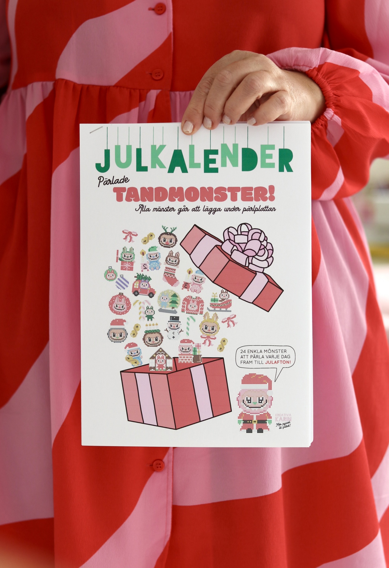 Tandmonster i julkostym som firar advent, bakar lussekatter, gömmer sig i paket, hämtar granen med bilen och mycket mer. Varje dag/lucka innehåller ett större (eller flera små) motiv, perfekt att skriva ut och skapa sin egna julkalender med en massor av härlig pärlglädje under december.