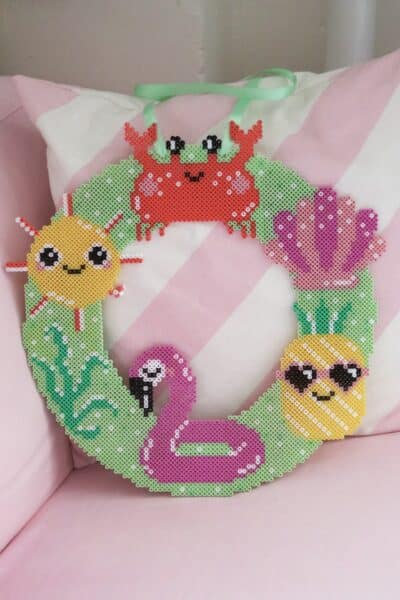 Dröm dig bort till tropiska stränder och salta havsbrisar med denna unika dörrkrans i pärlor. Mönstret innehåller allt man älskar med sommaren: en cool ananas, en strålande sol, en charmig flamingoformad badring, en busig västkustkrabba och en vacker snäcka – perfekt balanserade mot en skön grön bakgrund.