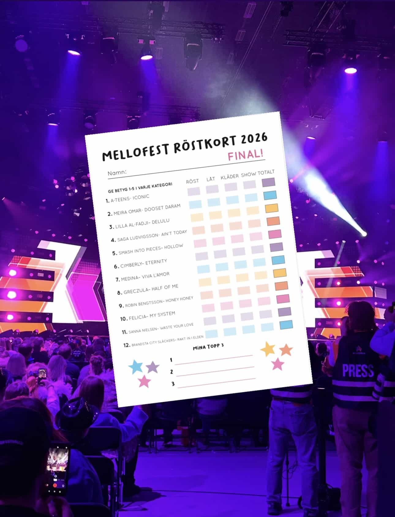 Använd dessa roliga röstkort på stora finalen av melodifestivalen på lördag, skriv ut så många röstkort du vill och förgyll kvällens festligheter! Fyll i ditt namn och ge varje bidrag 1-5 poäng för röst, låt, kläder och show! Perfekt att ha koll på alla låtar, artister och i vilken ordning de tävlar.
