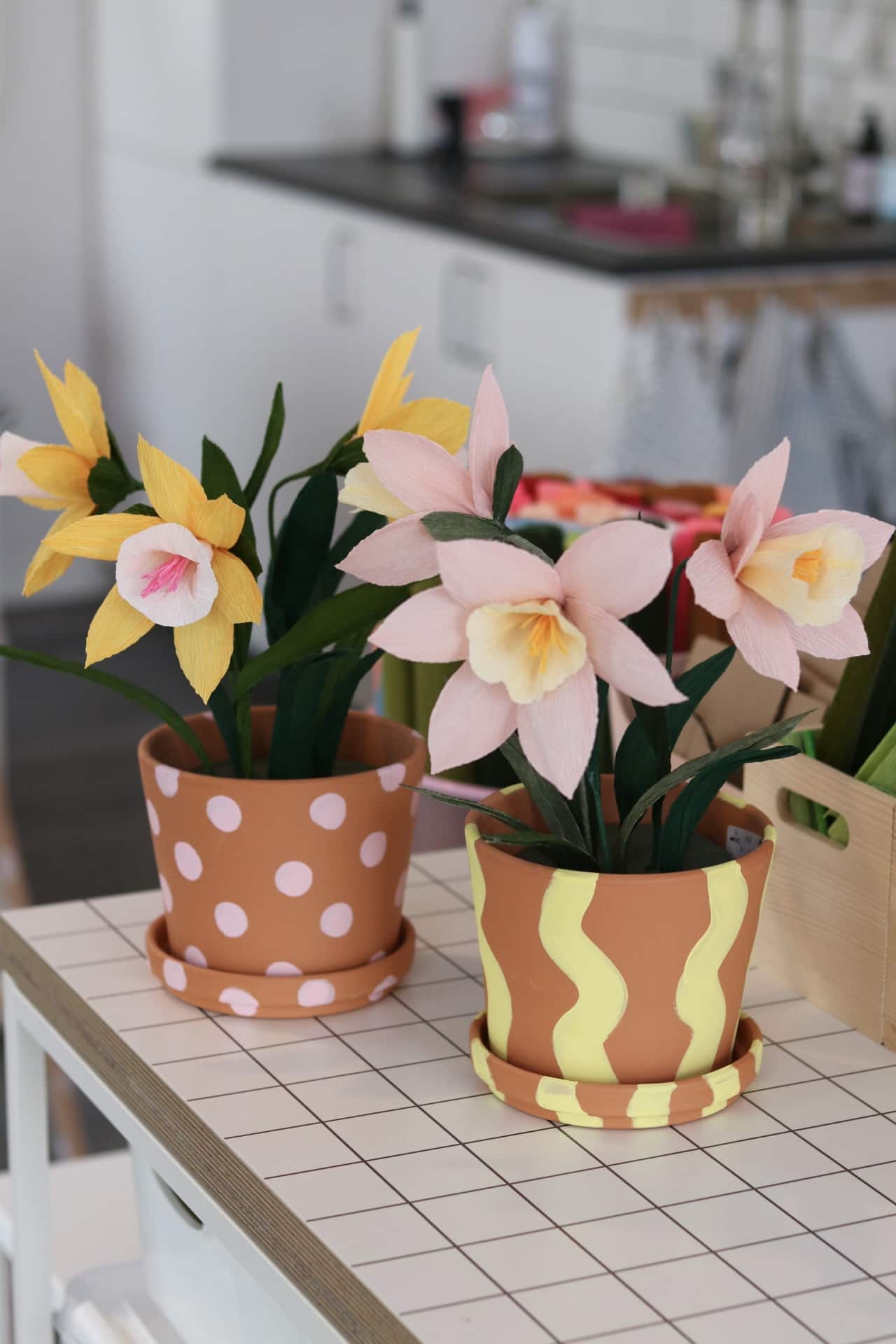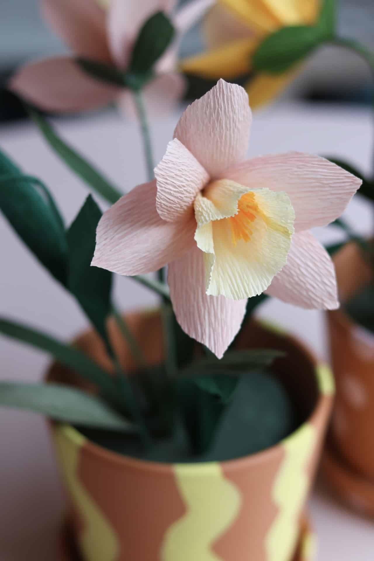 Skapa en dekorativ vårgrupp med påskliljor av crepepper! I denna DIY-beskrivning guidar jag dig steg för steg genom processen och du skapar en praktfull vårgrupp färdig att ställa på påskbordet eller i fönstret och ta fram år efter år!